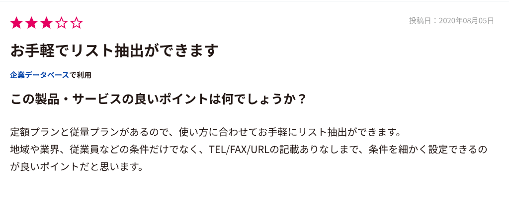 口コミでは「業界横断で幅広く精査できる」「事業所単位で抽出できる」といった声もあり、従来リスト購入では得られなかった詳細情報を活用できる点が支持されています。自社の営業戦略に合わせて条件を調整できる柔軟性は、効率的な新規開拓を目指す企業にとって大きな利点といえます。