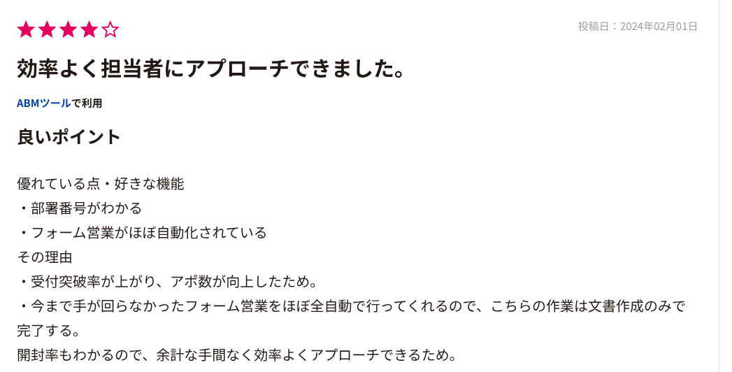 利用者からは「フォーム営業をほぼ自動化できる点が優れている」「リード情報が自動で企業データとリンクし、Salesforceなどで効率的に管理できる」との評価が多く見られます。さらに部署・人物情報を活用することで受付突破率が向上し、効率的にアポイントを獲得できる点も高く評価されています。