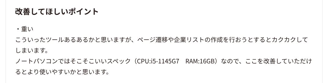改善点としては「ページ遷移が重い」「企業や人物情報の更新が追いつかないことがある」といった声が挙がっています。また、カスタマーサクセスの対応が受け身に感じられるとの意見もあり、機能面は高評価である一方、運用面での利便性強化を求める声も一部存在しています。