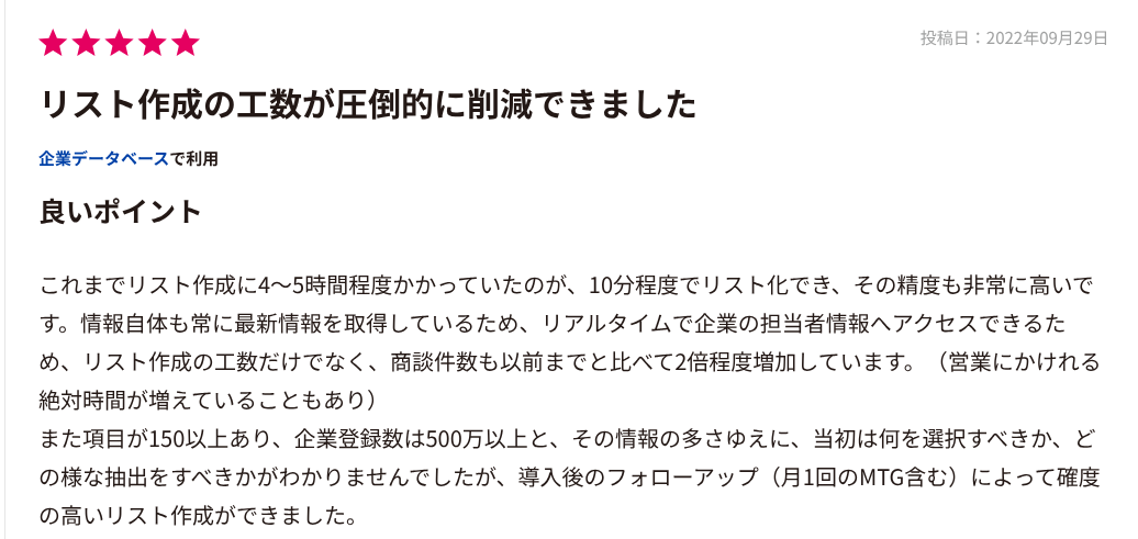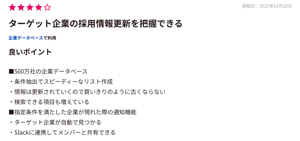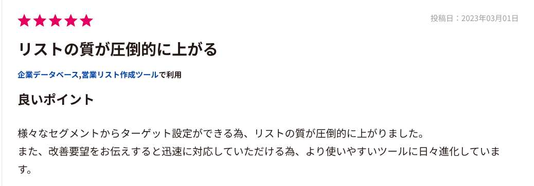 セグメント設定の柔軟さも口コミで支持されています。業種や従業員数だけでなく、資金調達の有無や決算期、求人状況など多様な切り口でリスト化できる点が特徴です。これにより、アポ率が上がった、リストの精度が改善されたとの声が目立ちます。営業施策において優先順位をつけやすく、ABM戦略や人材系サービスとの相性が良いと評価されています。